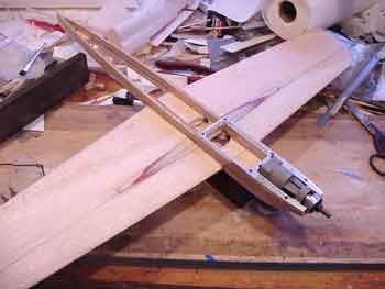 The wing is a cross lamination of 1/4" and 1/8" balsa with a 1/16" plywood inlay bellcrank mount on the top and bottom. The wing's leading and trailing edge was grooved to except a 1/32" x 1/4" plywood strip for protection, tne same goes for the stab. Controls are a 2" bellcrank with .032" wire leadouts exiting out a single hole, the elevator horn is a blank unit from Tom Morris, 3/32" wire and 1/16" 4130 horn brazed on, 3/32" pushrod is used .