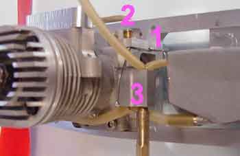 Next photo shows the top side, uniflow line that is piped to a point on the tank, 5/16" above the fuel pickup. Note the fuel overflow tube on top of the tank, mounted flush.