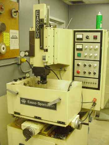 Picture to the right shows the Easco Sparcatron. It's setup like a conventional mill but has some features to help position and locate edges, dither and audible sensing. Dither is used to set your Z axies by moving the automatic ram down to the part and when it touchs, it stops. The audible features are used for locating X and Y positions, when touching the part, it makes a beep.