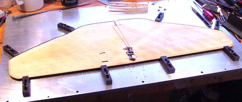 The picture below is the wing fixture I've decided to use. After seeing several sights and their methods for the crutch attachment, I decides to take a machinest perspective and started with a blanchard ground plate and machined up the clamps, ground the bottoms, with a groove located .275" up the side. The plate has the engine mounting pattern drilled into the plate to screw on the crutch. The plate is also scribed with one inch square quaderent lines to facilitate alignment.