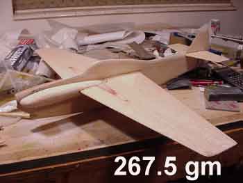 I assembled the pieces using epoxy and added a 8.6 gm 7lb balsa cowl, installed the blind-nuts for engine mounting and the 1/6" tail-skid. The total weight for the assembied structure came out to 267.5 gm as shown in the next picture.