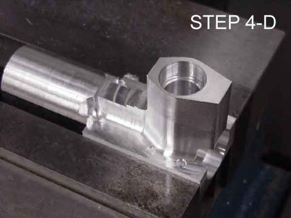 Step 7: Now we finish the intake, position at 25 degree down angle and hold by shank. To find X position, in Step 4 we milled in a step, this is our reference point to set X at 0 using a wiggler and use edge finder to set Y or to find center of the part on that axis. Tools needed are 1/2" end mill to flatten the area and 1/8" for cutting the port .200" deep .