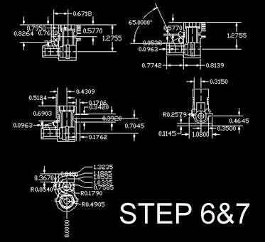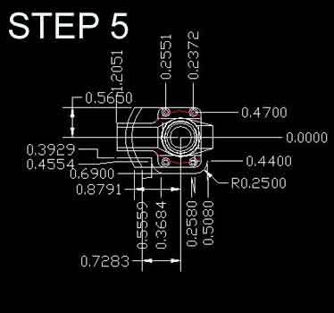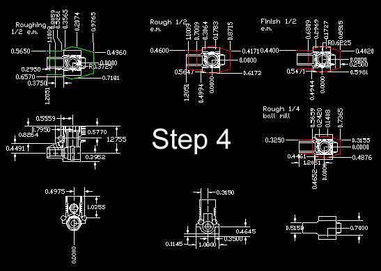 Step 4: Here's where we start, the contouring and clylinder bores. The print above may not make sense because is has reference points for CNC programing. We will need a 1/2" endmill for roughing and a 1/4" long carbide ballmill for contouring, 1/2" stub drill with 135 degree split point, 1/4" long carbide endmill, 1/8" long carbide endmill, 1/4" stub carbide endmill and a boring head for the liner, 5/32" endmill for spotting engine bolts and a 5/8-40 tap or thread mill for head mounting.