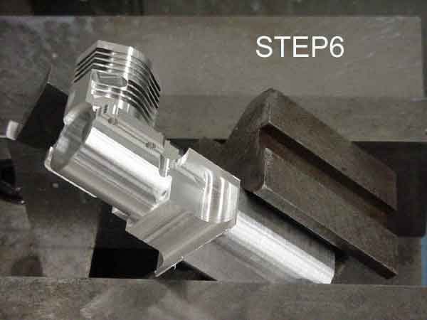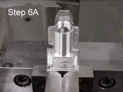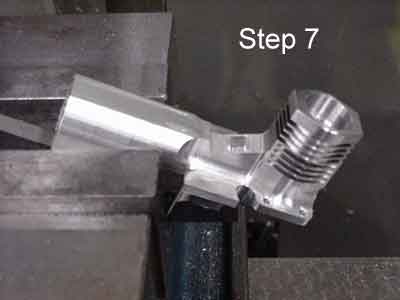 Step 6: This next setup is used to contour the bottom, round off, the case and cut the exhaust. Vise the piece between a jaw and a V-block by the 1" shank, crank bores pointed straight up for rear exhaust. Here's where I decide which exhaust style, piped or regular ( .400 max. exhaust allowed in restricied AMA events ). Set crank bores to 0,0 and cut bottom, you can use a rotary table for this opperation.