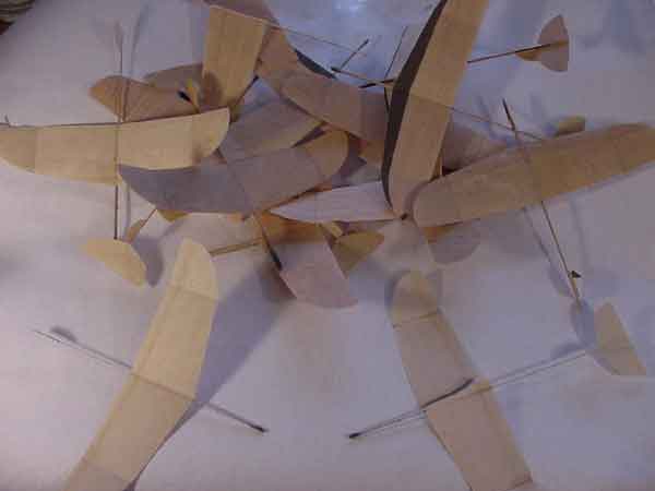 Some of my catapult gliders below, now, mostly distroyed from the high velosity launchs encountered. Glider on the lower right of picture weighs in at 1.49 grams and holds the current Cat. I Standard and Cat. I Unlimited Class Catapult records. The one to the lower left weighs 1.86 grams and were used to set the current Cat II Standard and Cat. II Unlimited records