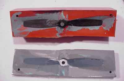Now let it stand for the required cure time, I let the F.C.C. sit for 24 hours before the box plates come off. Now pull the location pins out and using a chisel carefully work a corner until loose and then the opposite corner until the base plate comes off, do not twist but pull straight off. The mold top and prop should come the base together. If the prop sticks to the base remove it and reposition it into the top half of the mold. Now take a file and take the sharp edges off , it'll cut without you realizing. You'll note that some of the paint come off with the mold top, don't panic, it'll scrape off with your finger nail or a craft stick. You'll need to use a hobby knife to detail near the prop , scrape it and cut off paint around edges. PVA will stick to whatever you layup on it so, try not to distrub the mold top too much, even the moisture on your hands will melt it, hold with a paper towel.