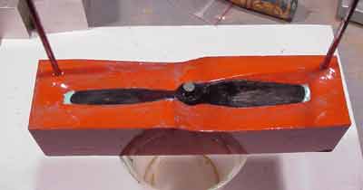 Photo to the left shows the top mold with pins reinstalled and PVA'd, top, pins and sides. Use some putty on the tips of the prop to smooth them in otherwise, when the top half is poured and is curing, it will snag the tips went it shrinks and distort. For the longest time I had a problem with the tips being thicker than the plug, this solved it.