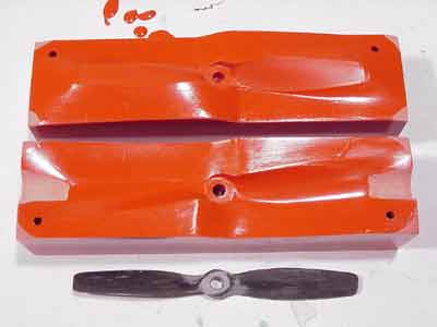 When pouring use a couple of craft stick and slowly pour over them and into the mold, it'll help take out more of the bubbles. Pour about to 1" for 1/2A props and 1 3/8" for larger and no more. I've found that 3" c-clamps are alot cheaper than the larger and you'll need a few, four for small and eight for those 13" stunt props. Good mold material will not crack at this thickness.