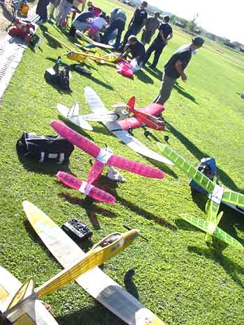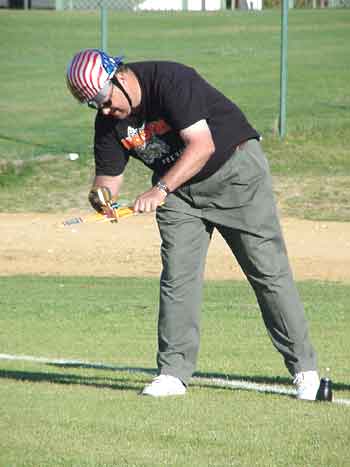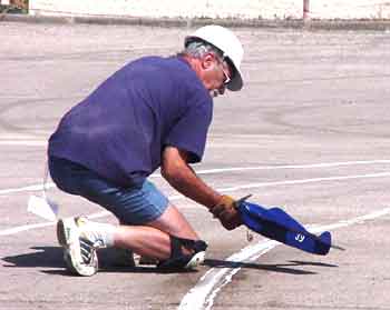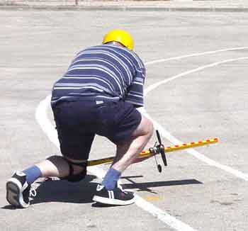 Above are the competitors getting ready for a heat race in Mini Goodyear. On the right is Mr. McD pitting Steve Wilk's entry and on the left, Steve having fun. The carpet made it alittle easier to fly on center but, that stake holding it down, proved to be a tough obstical to overcome.