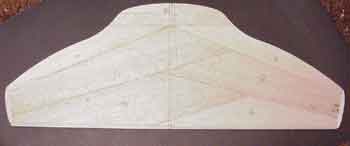 I've started by modifying Goran Olsson's TR, available from his web site, and redrawng it into a profile plan. The wing is started by using 3/16" 6 lb wood and arranging it in a jigsaw puzzle effect as viewed in the first photo, with the grain running in an anglular direction. The bottom part is 3/32" 5 lb wood with the grain running in a direction parallel to the leading edge. When gluing the edges together, promote no stress to mate them, so make sure the joints are perfect, this helps to keep from warping. Put on a coat of nitrate dope on the laminating surfaces and sand off the fuzz then, top and bottom are glued together with two layers of.03 oz carbon veil between, the dope prevents the epoxy from wicking into the grain, wet the veil on a plactic surface and use the playing card techique to squeegee out the resin so, it looks almost dry then, put between the top and bottom, roll out and press between two pieces of glass, with pressure. This process forms a ply, type lamination with excellent torsion stabiliy, add three stripes of 3/32" basswood on the outboard wing and one on the inboard leading edge, weight is 109 gm, at this point.