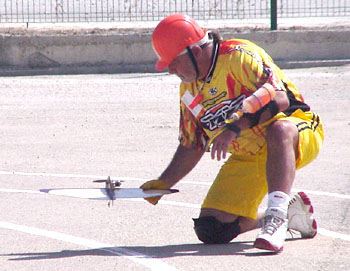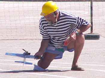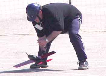 Above are the competitors getting ready for a heat race in Mini Goodyear. On the right is Mr. McD pitting Steve Wilk's entry and on the left, Steve having fun. The carpet made it alittle easier to fly on center but, that stake holding it down, proved to be a tough obstical to overcome.